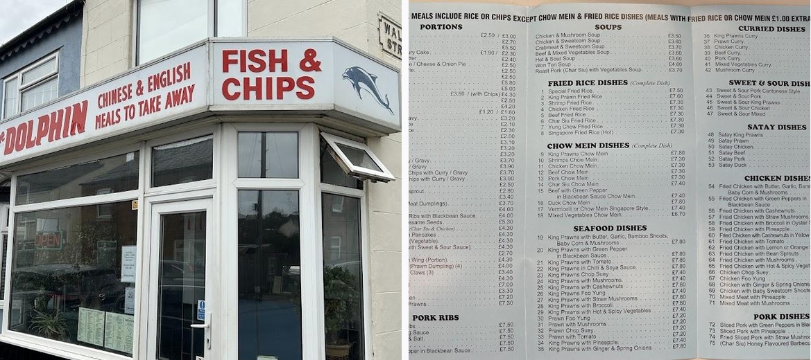 Best fish n chips I’ve ever had! These guys have nailed it. You’d think it was an easy thing to achieve but it’s evidently really not. We went to the seaside and for a treat we opted for the traditional post sea feast. There were not as many take aways here as there are in other towns - or we didn’t find them - so our search brought us here. At first given the offer was Chinese/English food we thought we might not get the trad chippy experience we were hoping for - but we could not have been more wrong! Honestly the chips were chunky golden and creamy tasting - no skimping on potato variety here! Plus the portion was large. The fish was gorgeous - a large piece in golden crispy satisfying crunchy and delicious - all served wrapped in paper with liberal salt and vinegar. I’m telling you this was better than any I’ve had in any chippy in many years. I could not recommend the Dolphin highly enough. Do not hesitate! Bring cash though as they don’t accept card at the time of writing Aug. ‘25